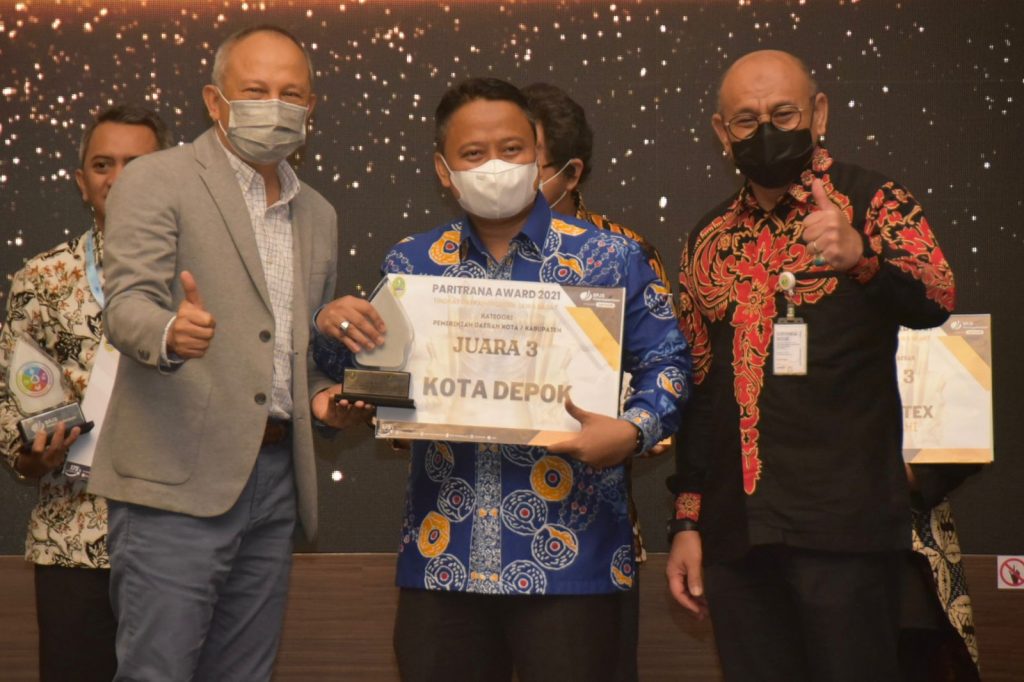 Prokopim.depok.go.id – Pemerintah Kota (Pemkot) Depok, kembali meraih penghargaan dalam bidang Jaminan Sosial Ketenagakerjaan berupa Anugerah Paritrana Tahun 2021 dari Pemerintah Provinsi Jawa Barat. Penghargaan ini diberikan kepada Pemerintah Daerah dan juga perusahaan yang tertib administrasi dan implementasi jaminan sosial. Kota Depok berhasil meraih peringkat ketiga terbaik dalam kategori Pemerintah Daerah Kabupaten dan Kota Tingkat Jawa Barat Tahun 2021.